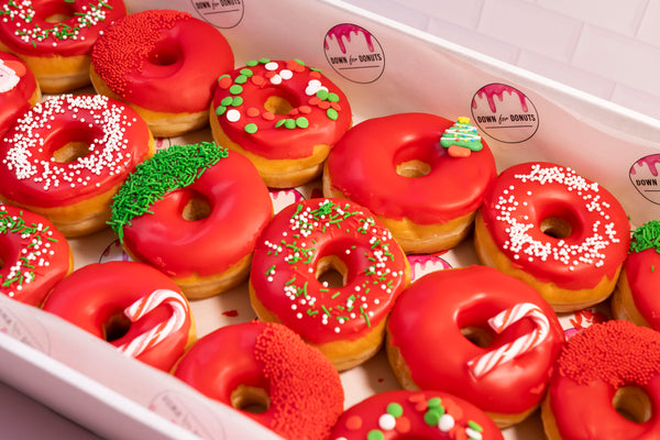 Our boxes come with 21 glazed and decorated donuts in our Signature Christmas decorations!